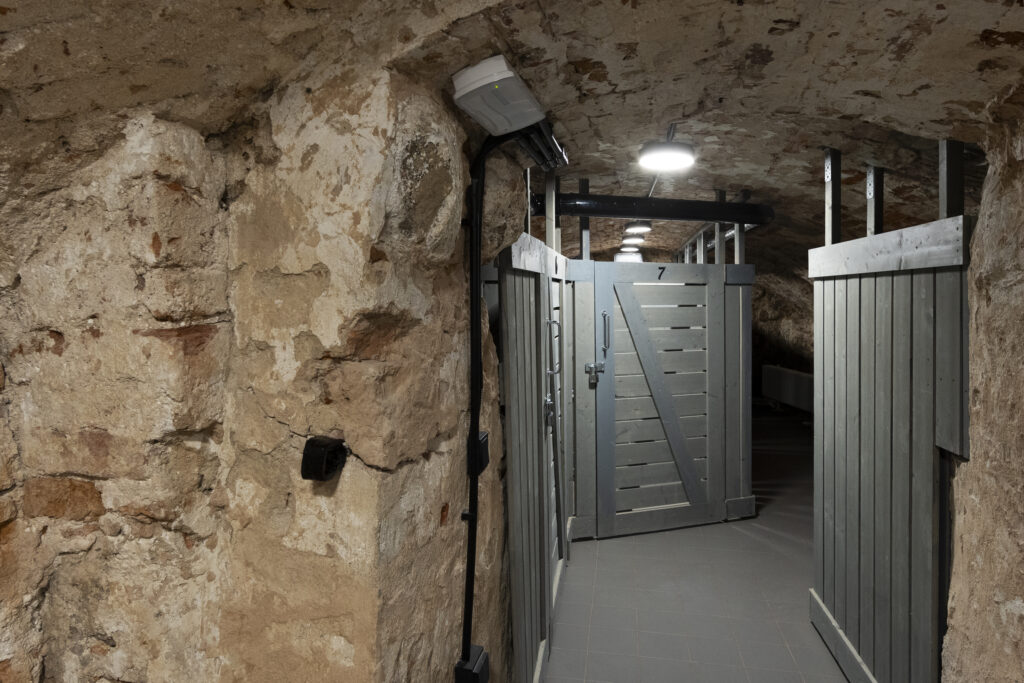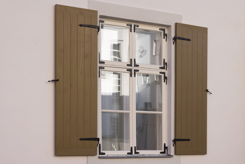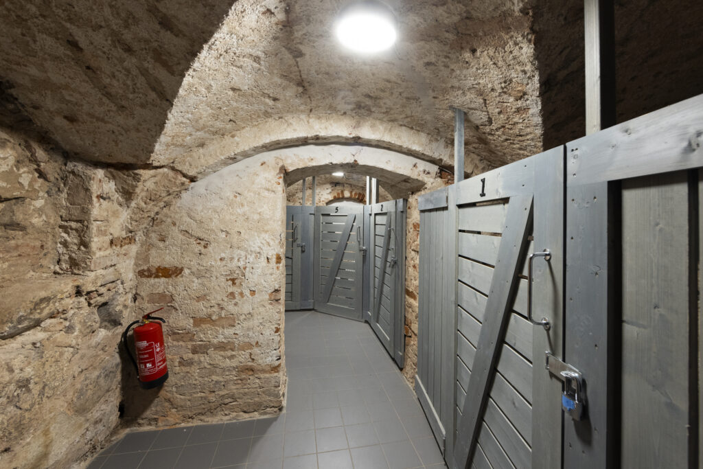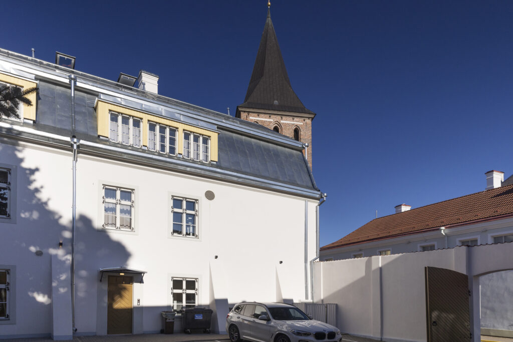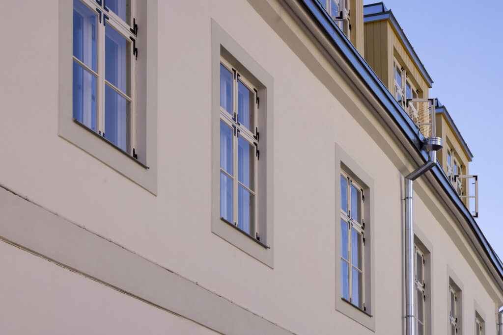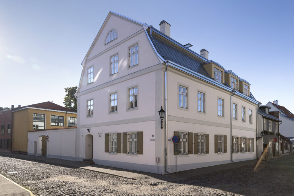 An example of historical baroque architecture with restored wooden window frames. The imposing building with strong ancient walls is located on the square of St John’s Church.