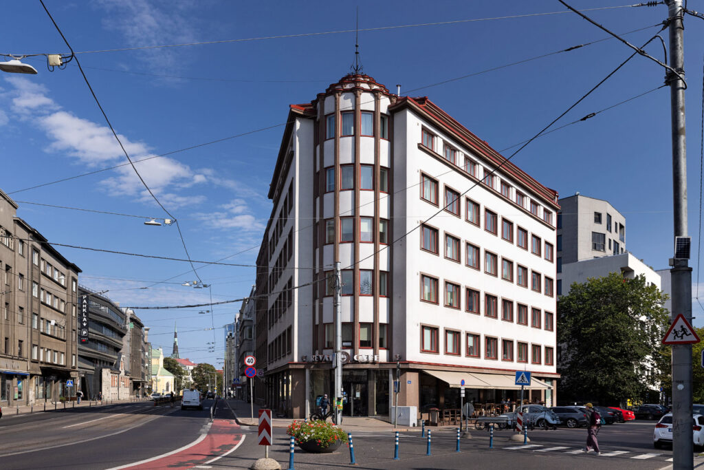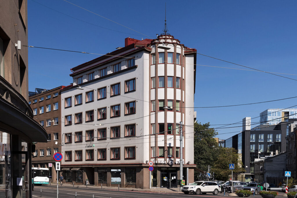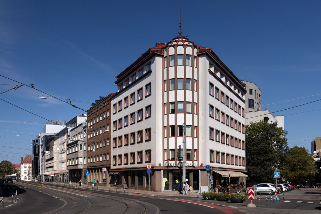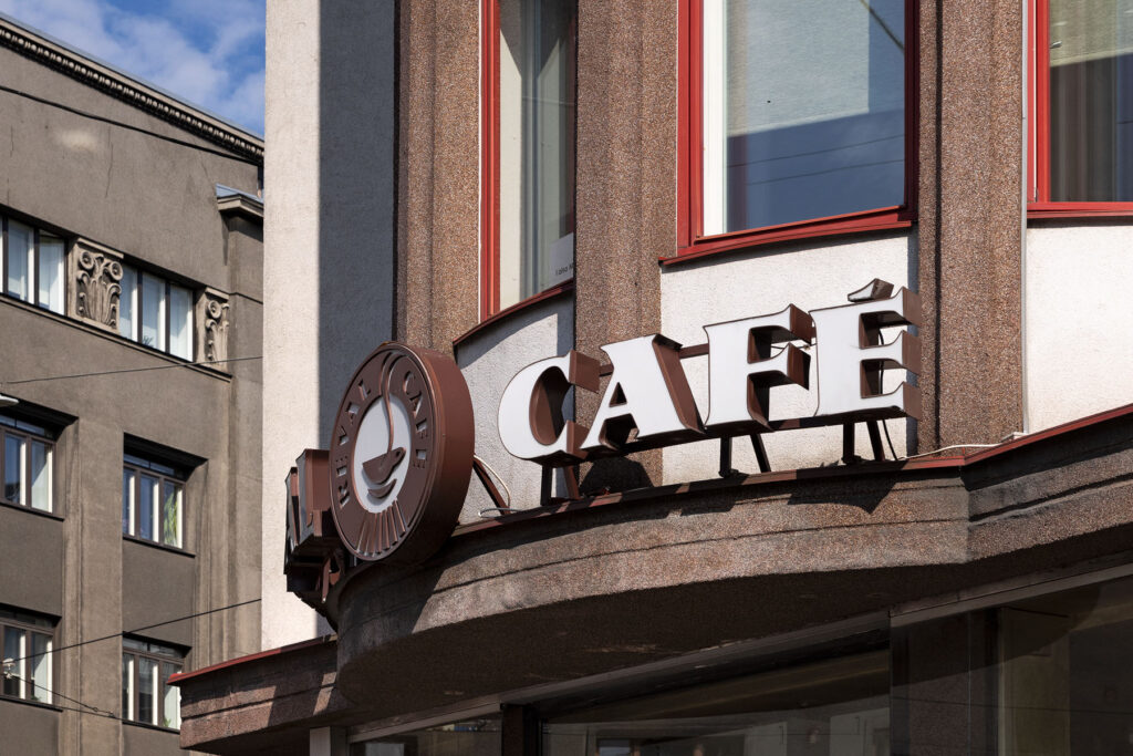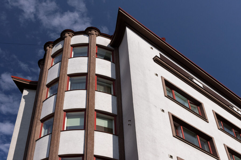 A functionalist building shaped like the bow of a ship at the crossing of two streets. The residents of the building love eating in the lively café downstairs.