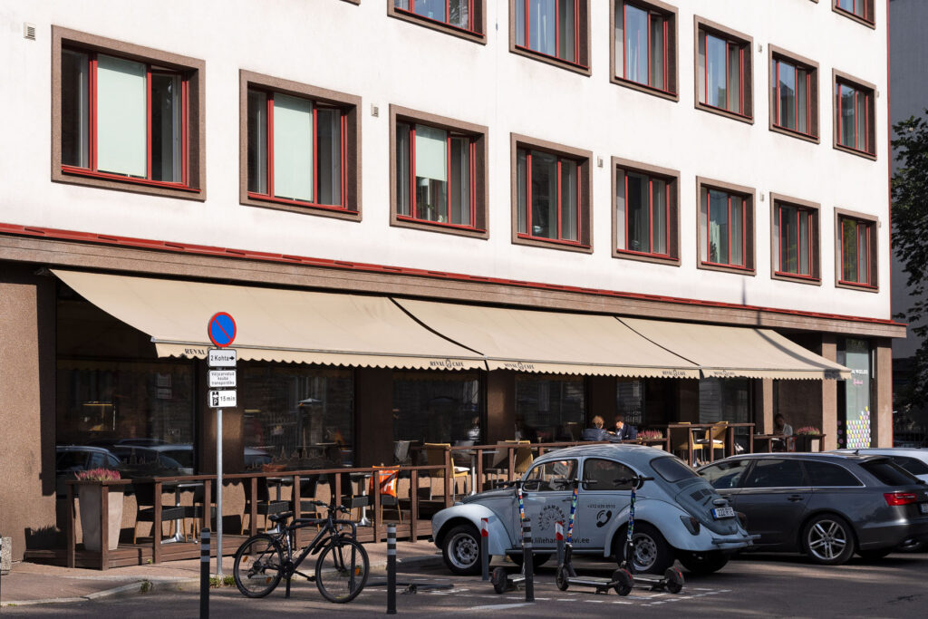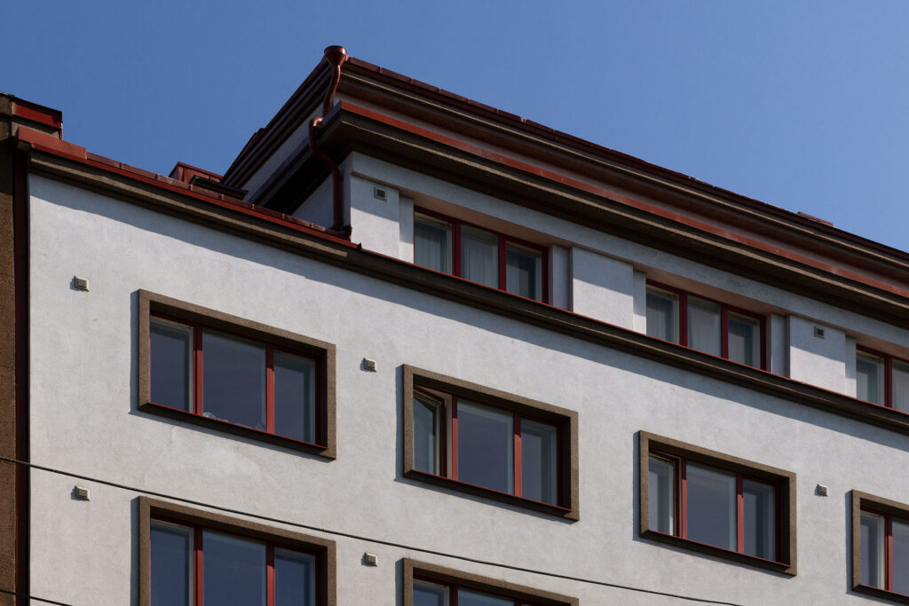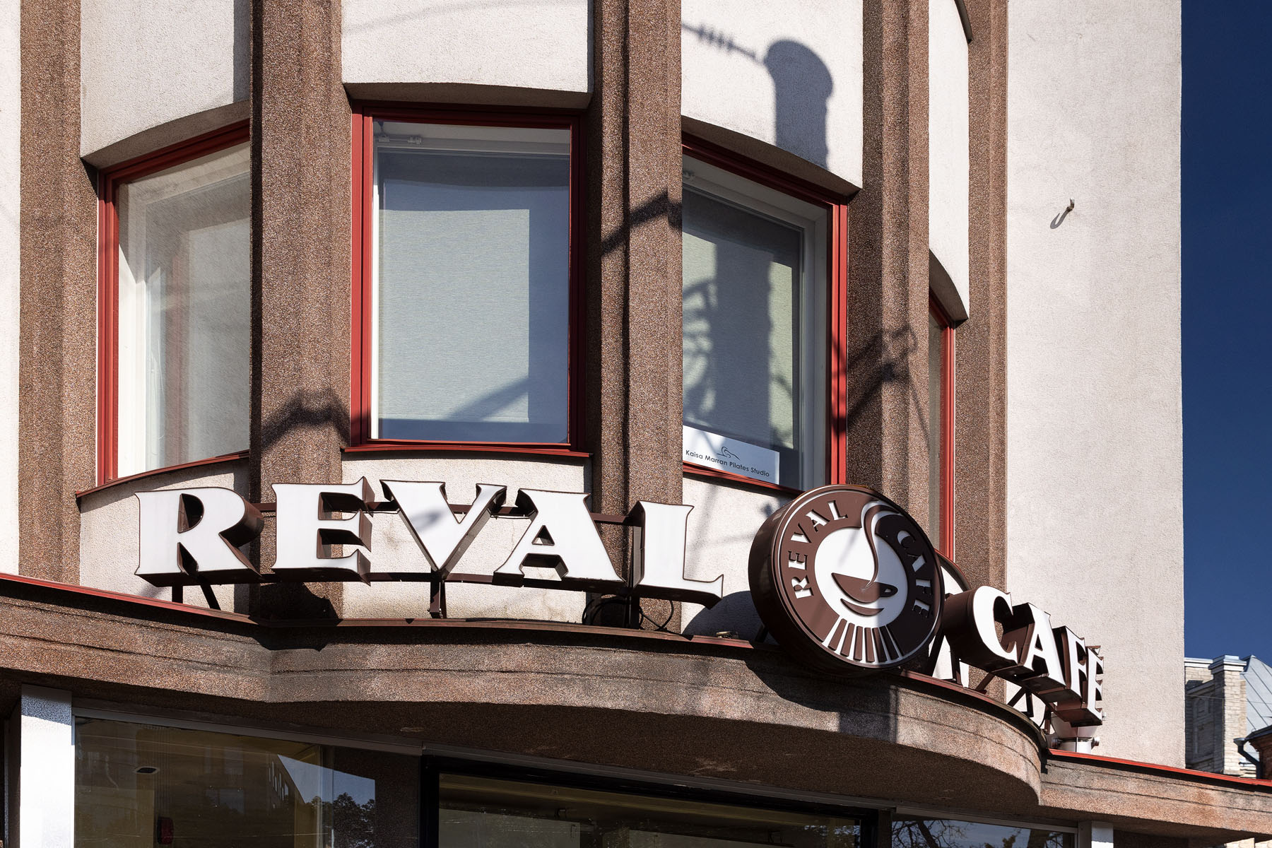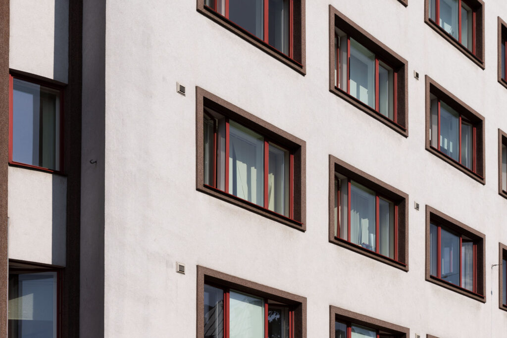 A functionalist building shaped like the bow of a ship at the crossing of two streets. The residents of the building love eating in the lively café downstairs.